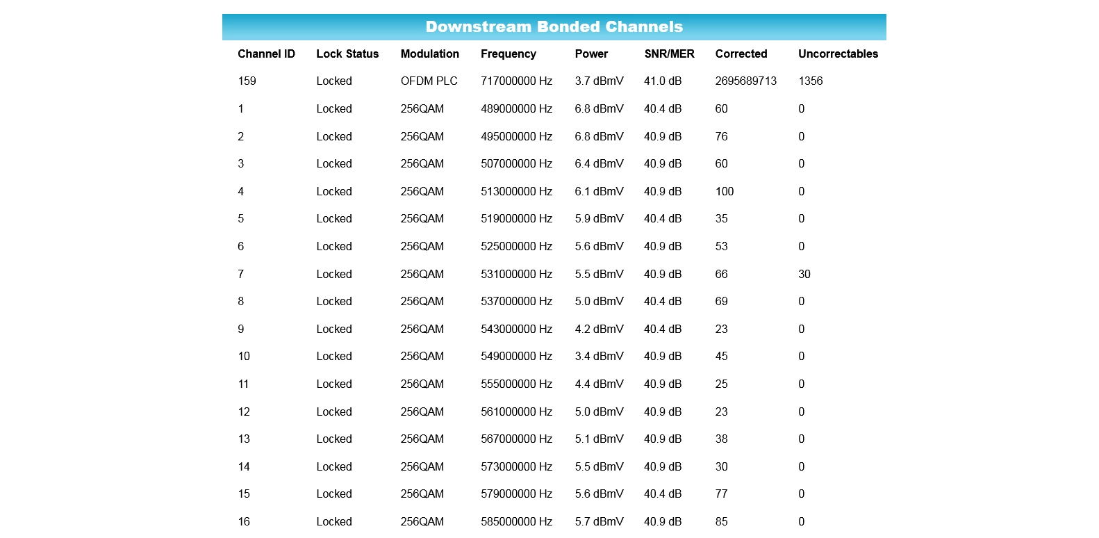 Hello everyone, does anyone have any idea what this means ? When i go onto my router webpage( optimum is the cable provider) and go on the downstream connection page, which shows many channels, the latest is it says i am on channel 159 and it show a lot of corrected and uncorrectables any ideas what this means?