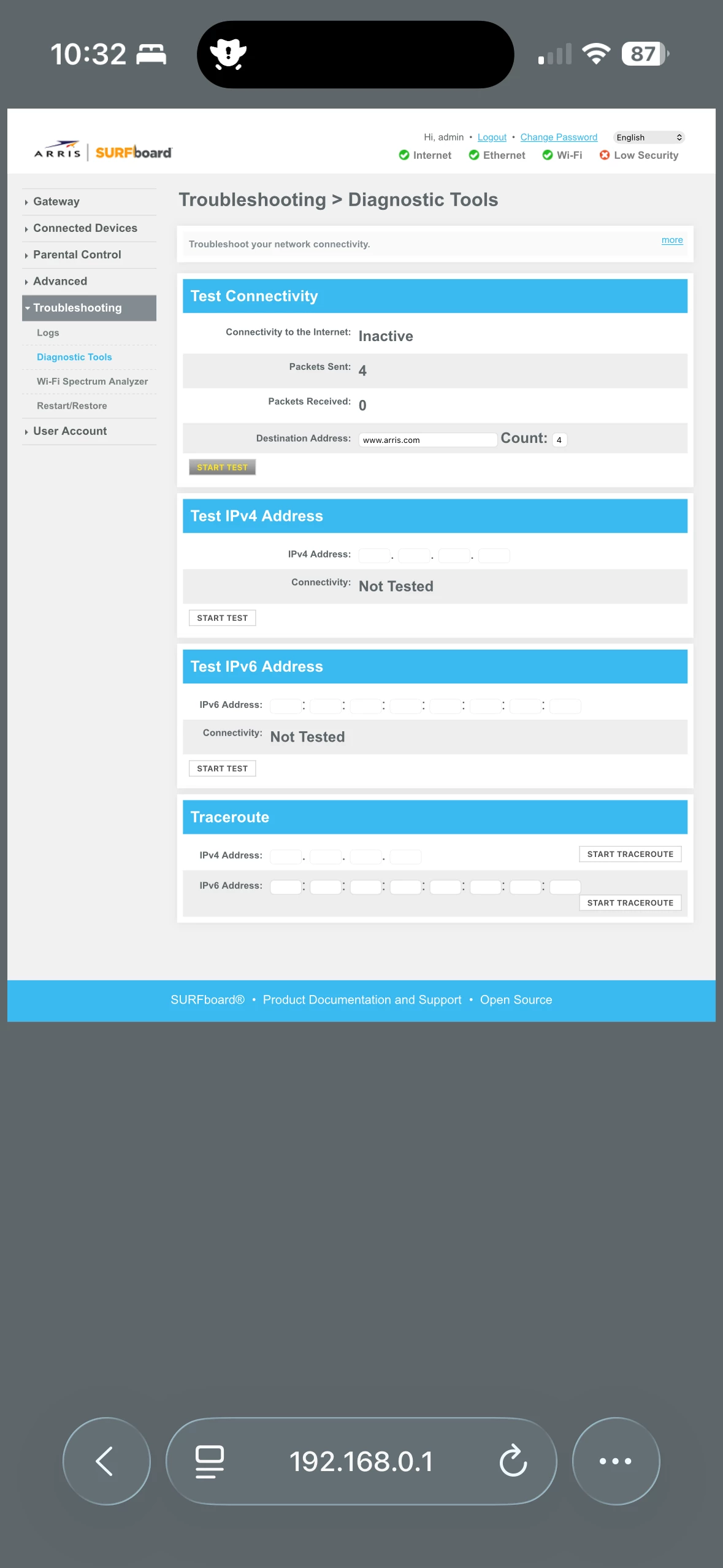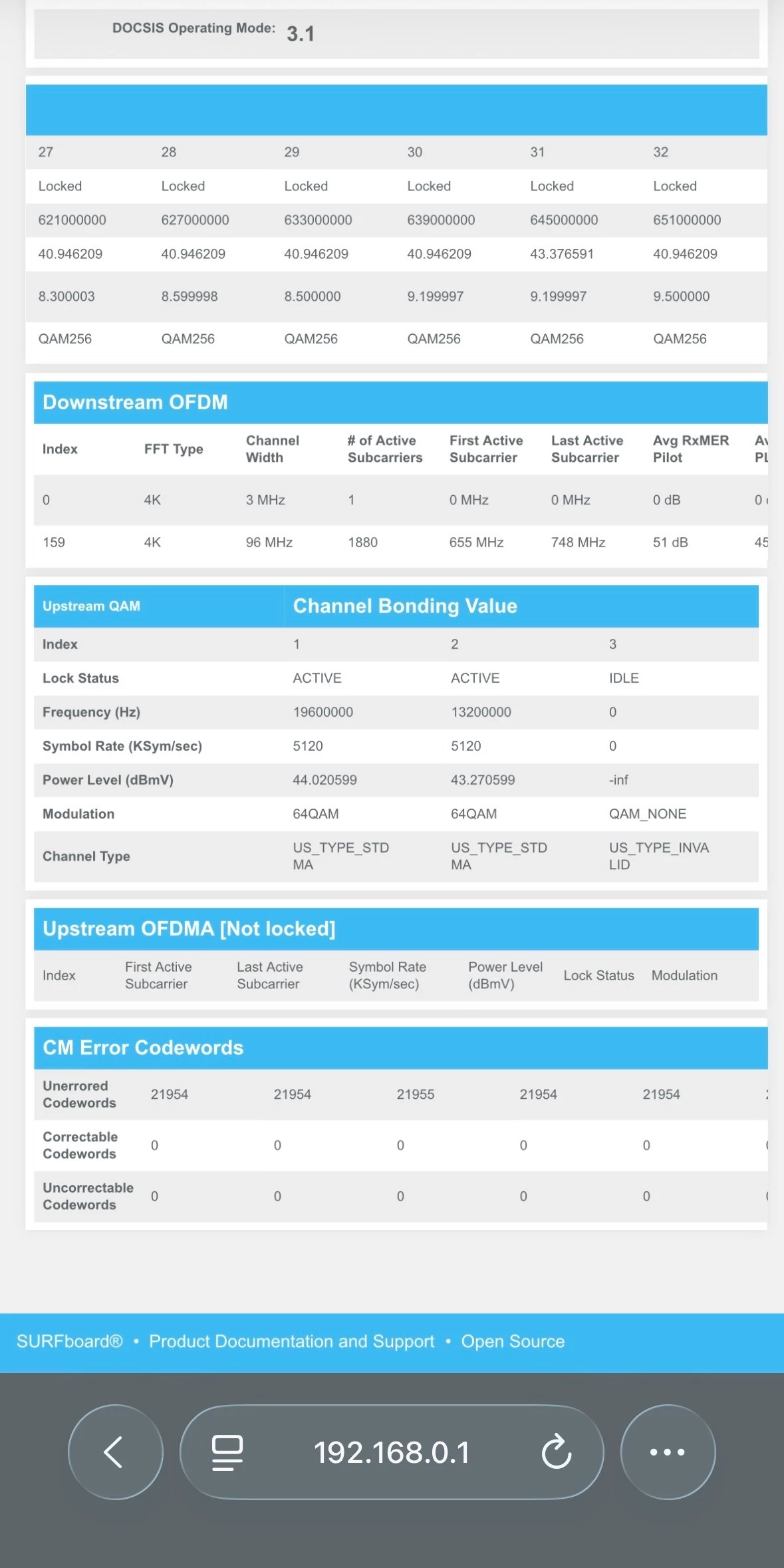 My modem disconnects from the internet several times during the day. Our provider is Spectrum. They have stopped by several times and even replaced the cable from the pole to my box. My downstream and upstream QAM values are shown in the photo. I connected to the box using 192.168.0.1 when the internet was out and under Troubleshooting | Diagnostic Tools under Test Connectivity the status showed “Inactive”. I am not sure what that means.